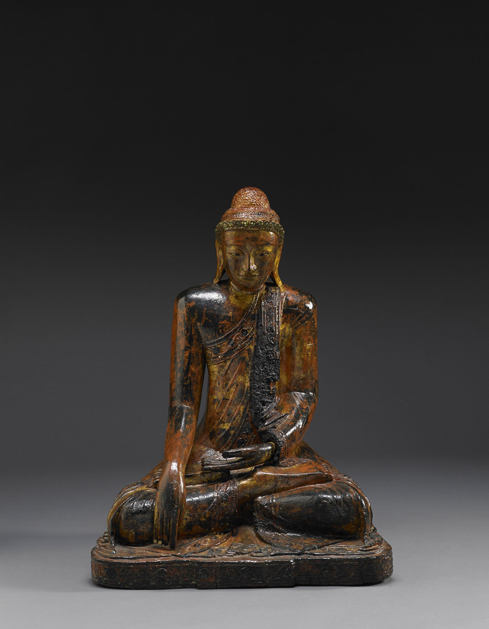 Buddha in legno intagliato e dorato, raffigurato seduto a gambe incrociate, il volto sereno incorniciato da orecchie dai lunghi lobi, le vesti decorate drappeggiare elegantemente sul corpo, le mani in Bhumisparshamudra Tailandia, sec. XX A carved and gilt wood seated Buddha, depicted cross-legged, the face with serene expression, with long-lobed ears, the ornate robes elegantly draping the body, the hands in Bhumisparshamudra Thailand, 20th century (h cm 79)