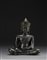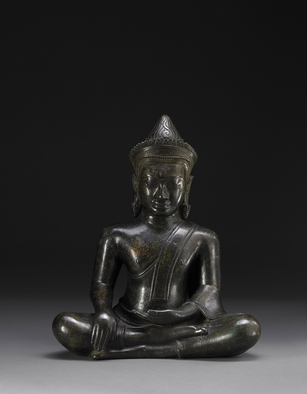 Buddha in bronzo raffigurato seduto a gambe incrociate, una corona sul capo, le orecchie con pendenti incorniciano il volto sereno, le mani in Bhumisparshamudra, le vesti con delicati drappeggi Cambogia, XVIII/XIX secolo A bronze Buddha depicted cross-legged, a crown on his head, the ears with pendants, a serene facial expression, the hands in Bhumisparshamudra, the robes gently draping the body Cambodia, 18th/19th century (h cm 37)