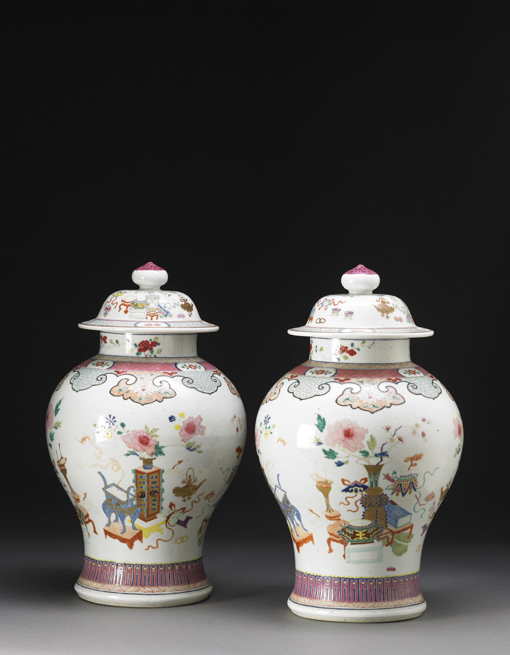 Coppia di vasi a balaustro in porcellana con coperchio, decorati in famiglia rosa e doratura con oggetti preziosi e fiori, sotto una ricca bordatura geometrica, il coperchio con pomello in fiore di loto (una sbeccatura sul coperchio; piccole mancanze agli smalti) Cina, sec. XVIII A pair of Famille Rose baluster vases and covers, each decorated in gilt and enamels with precious objects and flowers below a rich lappet border, each cover with lotus-shaped finial (one section to one cover missing, minor losses to the enamels) China, 18th century (h cm 43)
