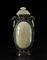 Vaso con coperchio, ogni lato decorato con placche di giada di forma ovale e di un color celadon chiaro, finemente intagliate con figure in un paesaggio, inserite su metallo brunito lavorato a sbalzo e decorato con pietre dure, le due anse leonine con anelli in giada e il coperchio con decorazioni geometriche Cina, XVIII/XIX secolo Prov.: collezione privata milanese, acquistato a Hong Kong il 2 Aprile 1966, certificato originale A jade and metal vase and cover, each side with inset oval jade plaques, each of a pale celadon tone and finely carved with figures in a landscape, the metal body decorated with semi-precious stone, the lion-mask handles suspending jade rings and the jade cover with incised lappets China, 18th/19th century Provenance: a Milan private collection, purchased in Hong Kong on 2nd April 1966, original certificate (cm 22x9x7)