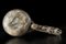 Specchio montato in argento cesellato e giada, l'argento è sbalzato con due figure a tutto tondo di pipistrelli, immagine di buon augurio, e cesellato a motivi floreali. La pietra posteriore (cm 2,5x14), a forma di coppetta fonda, in nefrite bianco e grigio, raffigurante una coppia di pipistrelli posata su due grandi pesche, motivo benaugurale di felicità e lunga vita (fu shou shuang quan). L'impugnatura foggiata a gancio di fibbia (cm 15,5x3x3) con estremità a protome felina affrontata da un più piccolo felino in altorilievo con la pianta di longevità (lingzhi) fra le fauci. La pietra è in nefrite grigia tinta a sfumature nere Cina, sec. XX A silver-mounted jade hand mirror, the white and greyish nephrite carved with two bats perched on peaches, well-wishing symbols of happiness and long life (fu shou shuang quan) China, 20th century (cm 3,5x29x13,3)