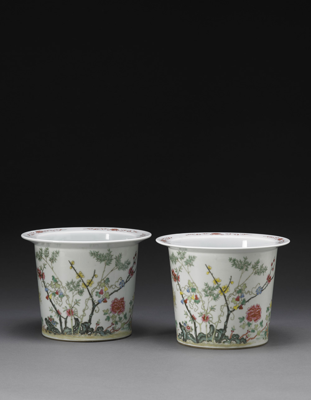 Coppia di cachepot in porcellana di forma cilindrica decorate in famiglia rosa con rami di peonie, bambù, pruno, crisantemo e altri fiori tra rocce ornamentali, il bordo superiore con decorazione floreale stilizzata, marchio Hong Xian a quattro caratteri in rosso ferro alla base, due fori circolari sul fondo Cina, inizio sec. XX A pair of Famille Rose cylindrical jardinieres, each decorated with flowering peonies, bamboo, prunus and chrysanthemum beside pierced rocks, the upper rim with iron red stylised floral decoration, Hong xian four character mark to the base, two circular holes to the base China, early 20th century (diam. cm 17,5, h cm 14)