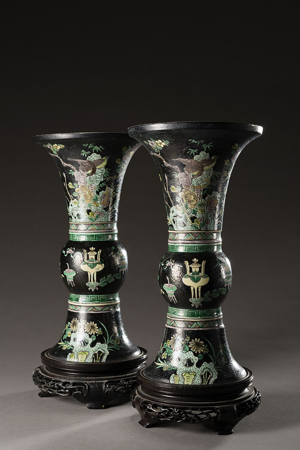 Coppia di vasi in porcellana a tromba, gu, con decoro a famiglia verde su fondo nero, con oggetti preziosi e fiori suddivisi in tre registri, base di legno attaccate (uno restaurato) Cina, sec. XIX A pair of porcleain trumpet vases, gu, decorated in Famille Verte on a black ground with three bands of precious objects and flowers, with attached wood stand (one restored to the mouth) China, 19th century (h cm 23)