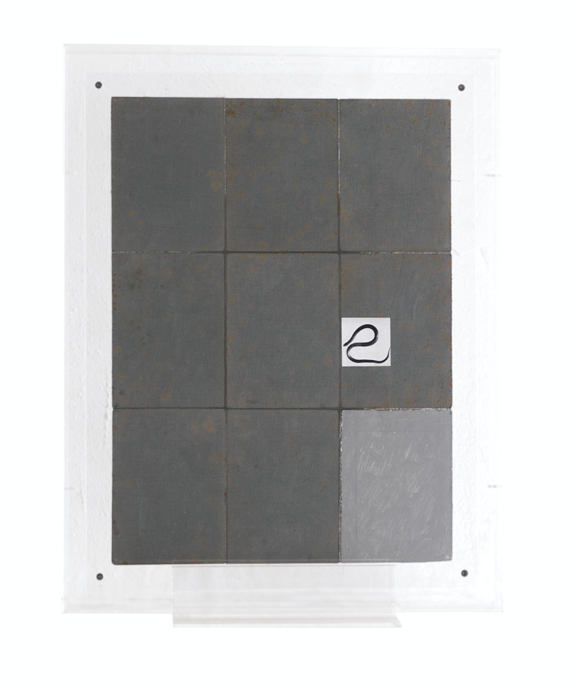 JAMES BROWN Los Angeles 1951 Snakes Without Mat, 1993 collage e pittura su tela di lino con ripiegature, con mappa sul retro cm. 52,9x39, firma e anno al retro in basso a destra della mappa, dichiarazione d'autenticità dell'artista su foto, pubblicato sul catalogo "James Brown, Opera contro natura" a cura della Galleria d'Arte Moderna e Contemporanea della Repubblica di San Marino, Edizioni Skira, entro teca in plexiglass con piedistallo per appoggio.