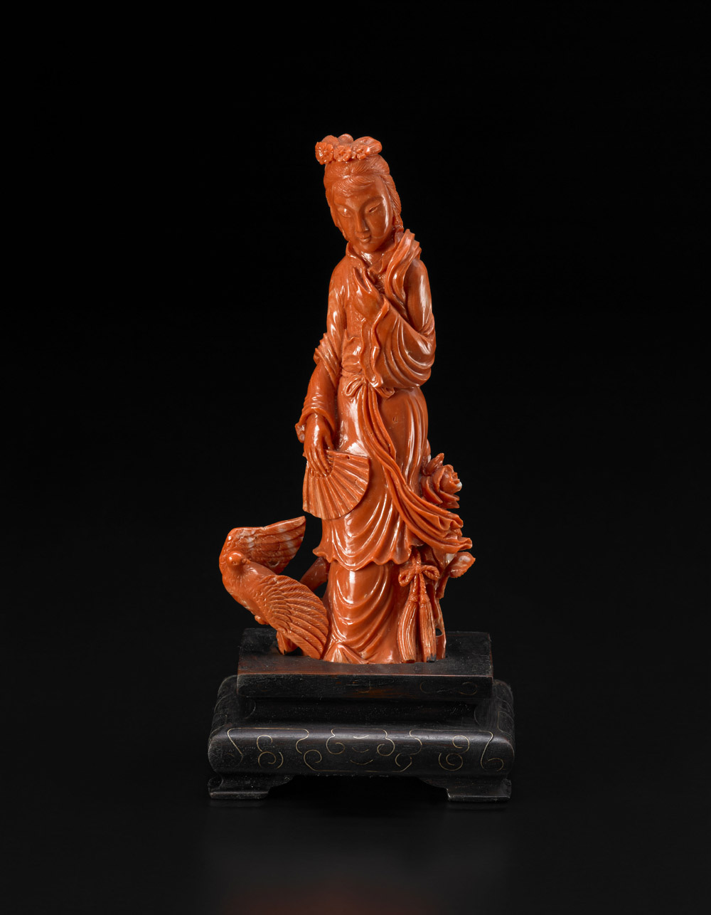 Piccola scultura in corallo rosso raffigurante una dama elegantemente vestita con capelli intrecciati, un ventaglio nella mano sinistra, affiancata da un uccello e da rami fioriti (mancanze minime) base in legno Cina, inizio sec. XX A small red coral carving of a standing lady wearing long robes and carrying a fan In her right hand, flanked by a bird and a flowering branch (very minor losses) attached wood stand China, early 20th century (h cm 13,5, peso lordo 228,5 gr.)