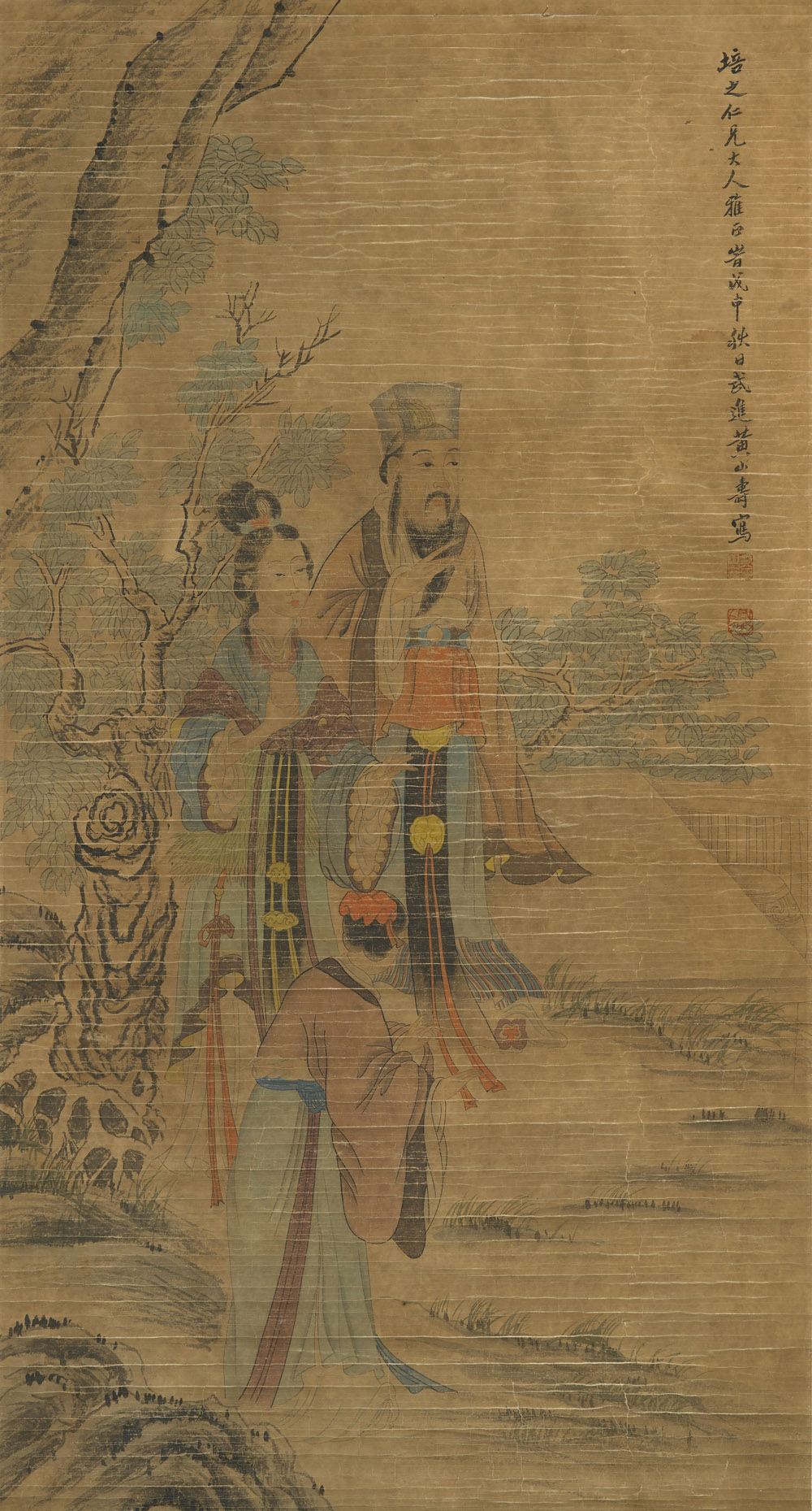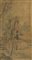 Dipinto con letterato e servitori in un paesaggio tra alberi e rocce ornamentali, con calligrafia Inchiostro e colore su carta, montato (con difetti e mancanze) Cina, XIX/XX secolo A painting of literature with attendats in a landscape amongst trees and rocks Ink and colours on paper, mounted (losses, wear and creases) China, 19th/20th century (cm 78x200)