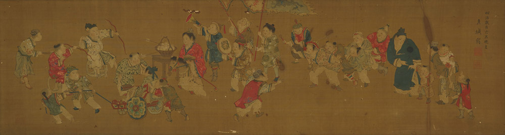 Dipinto con fanciulli, con firma Atsushi Joh e datato 1908 Inchiostro e colore su carta Giappone, sec. XX A painting with boys, with a signature reading Atsushi Joh and dated 1908 Ink and colours on paper Japan, 20th century (cm 151x45)