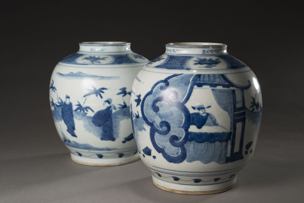 Coppia di piccole giare in porcellana bianca e blu decorate con figure in un...