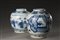 Coppia di piccole giare in porcellana bianca e blu decorate con figure in un paesaggio con pagode, marchio con lepre sul fondo Cina, sec. XIX A pair of blue and white ginger jar decorated with figures in a landscape with buildings, a hare-mark to the base China, 19th century (h cm 18)