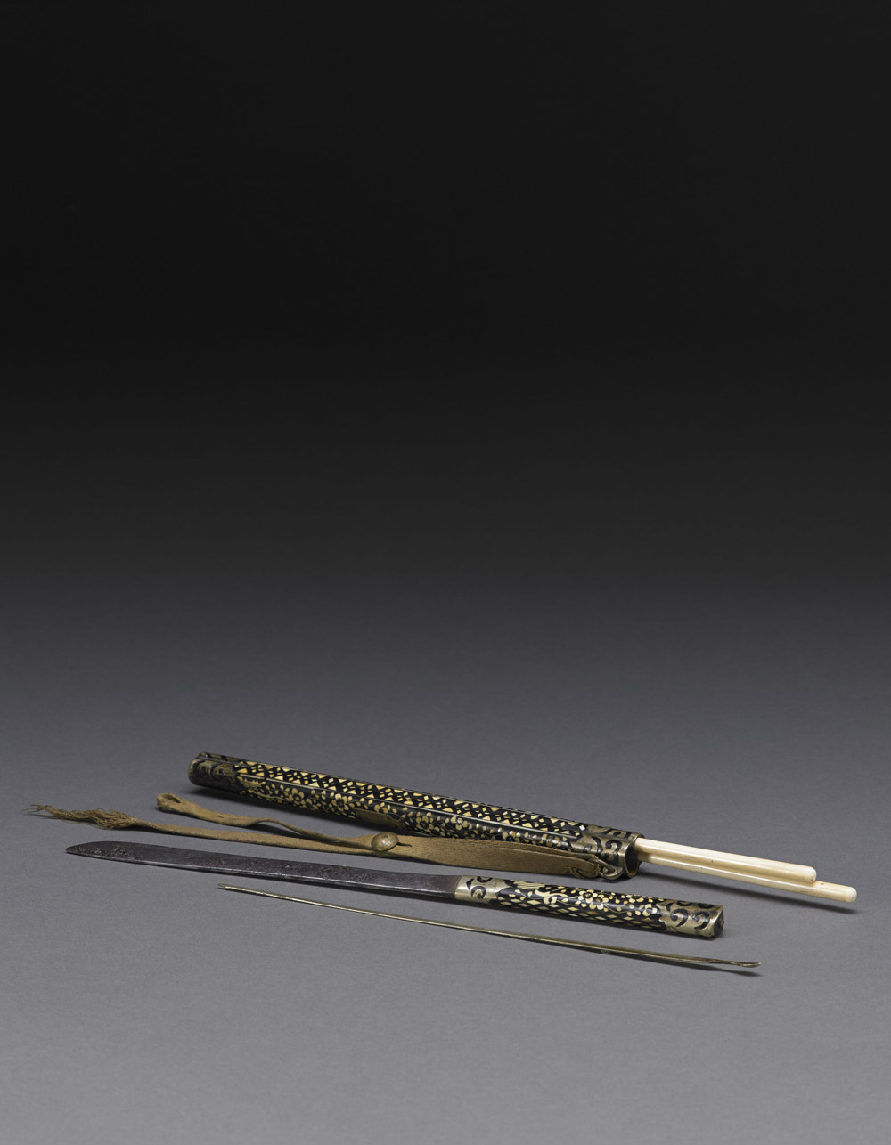 Set da caccia con decorazione floreale realizzata con osso intarsiato, composto da un paio di bacchette e un coltello Cina, XIX/XX secolo A hunting set with floral decoration realized in inlaid-bone, comprising a pair of chopsticks and a knife China, 19th/20th century (l cm 28)