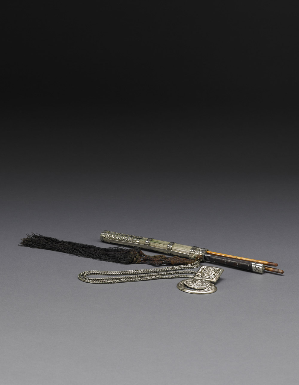 Set da cacciatore in metallo e osso, composto da un paio di bacchette e un...