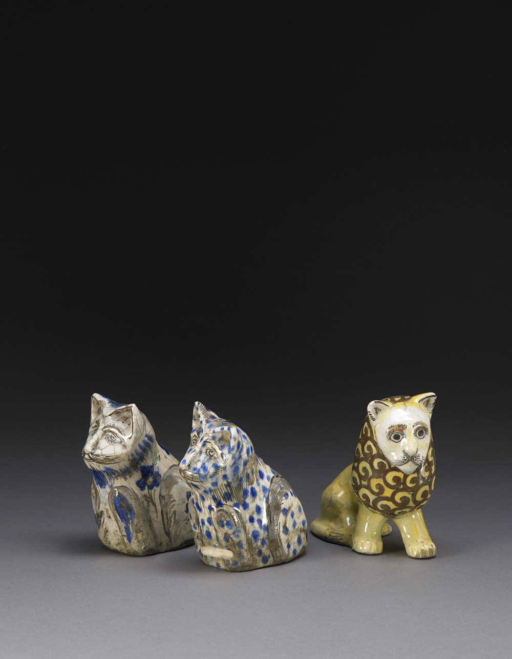 Tre gatti in terracotta Qajar, decorati sottocoperta con smalti decorati Persia/Iran, fine XIX/inizio XX secolo Three Qajar pottery figurines of cats Persia (Iran), late 19th/early 20th century (h max. cm 14)