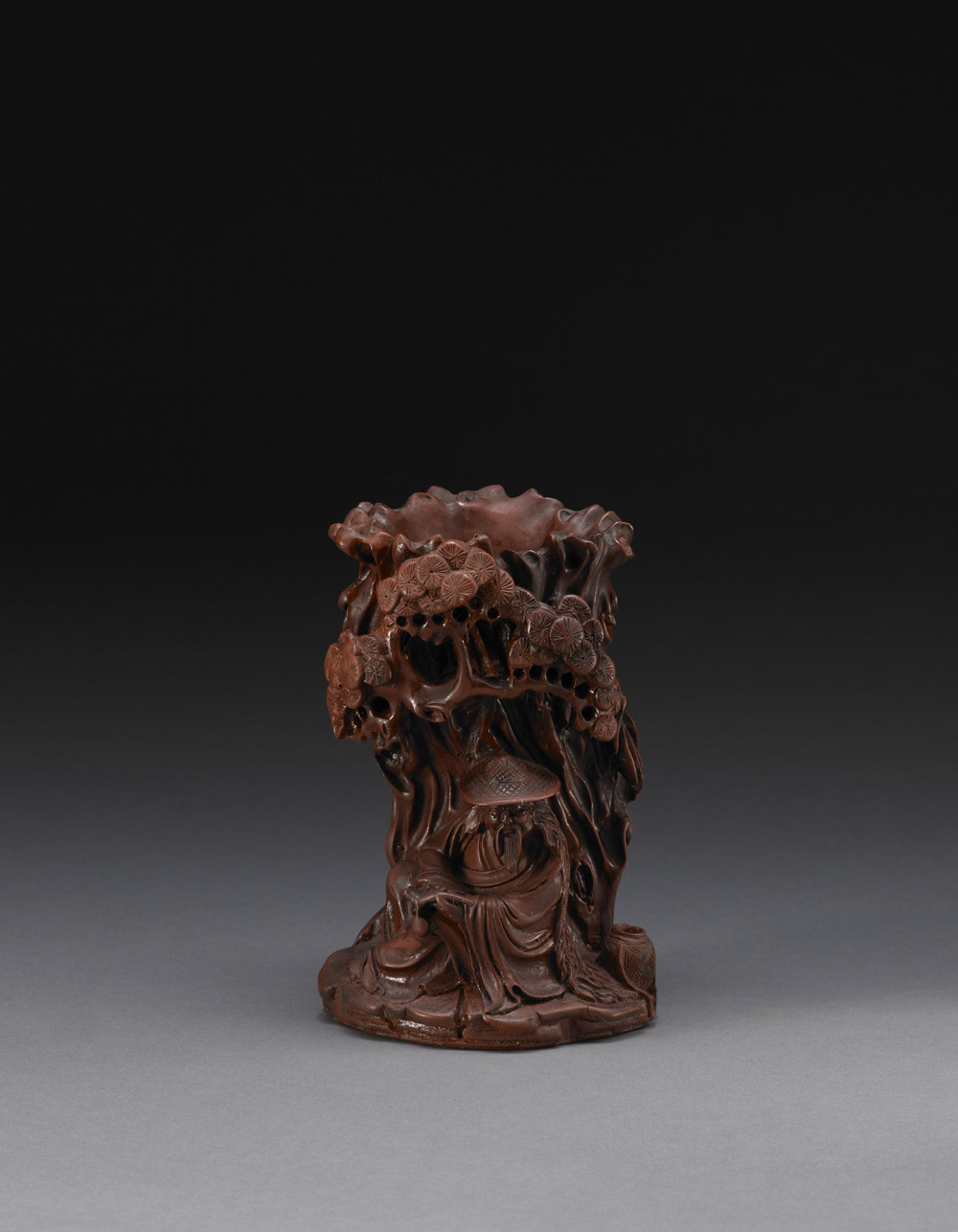 Portapennelli in legno intagliato a forma di tronco d'albero con figura di saggio Cina, seconda metà sec. XX A wood brushpot carved in the form of a tree trunk decorated with a sage China, second half of 20th century (h cm 18)