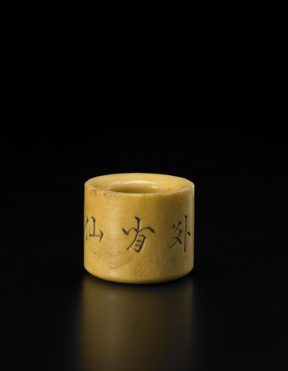 Anello da arciere in avorio, decorato con delicate incisioni di caratteri...