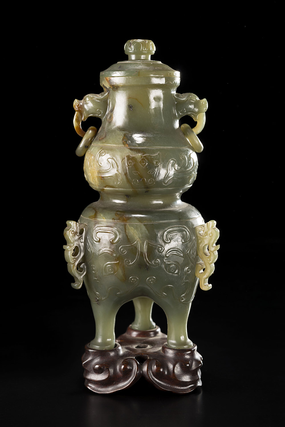Vasetto in giada spinacio a forma di vaso rituale arcaistico decorato con mascheroni Taotie, su base in legno sagomata Cina, secc. XIX-XX Prov.: "Gioielli Martignetti, Milano - Salsomaggiore", etichetta A spinach jade archaistic shaped vase, decorated with Taotie motifs, wood stand China, 19th/20th century (h cm 16) Provenance: "Gioielli Martignetti, Milano - Salsomaggiore" label under the base