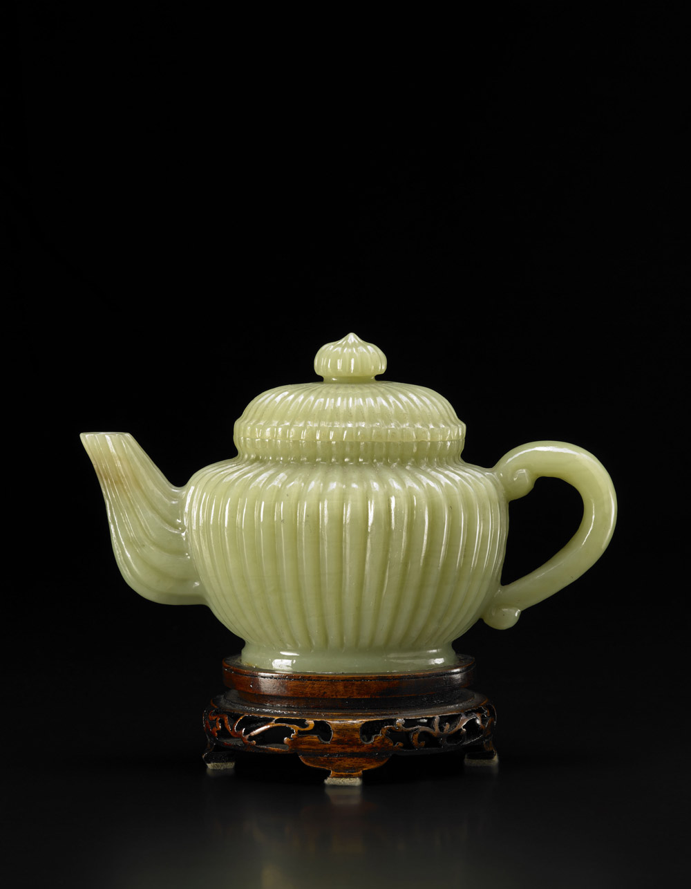 Piccola teiera con coperchio in giada col celadon scuro, il corpo lobato dalla forma tondeggiante, il manico liscio, la pietra con naturali inclusioni e venature, con base in legno Cina, sec. XX A dark celadon jade teapot and cover, the lobed body of globular form, the handle plain, the stone with natural inclusions and flaw lines China, 20th century (lunghezza max./length max. cm 18,5)