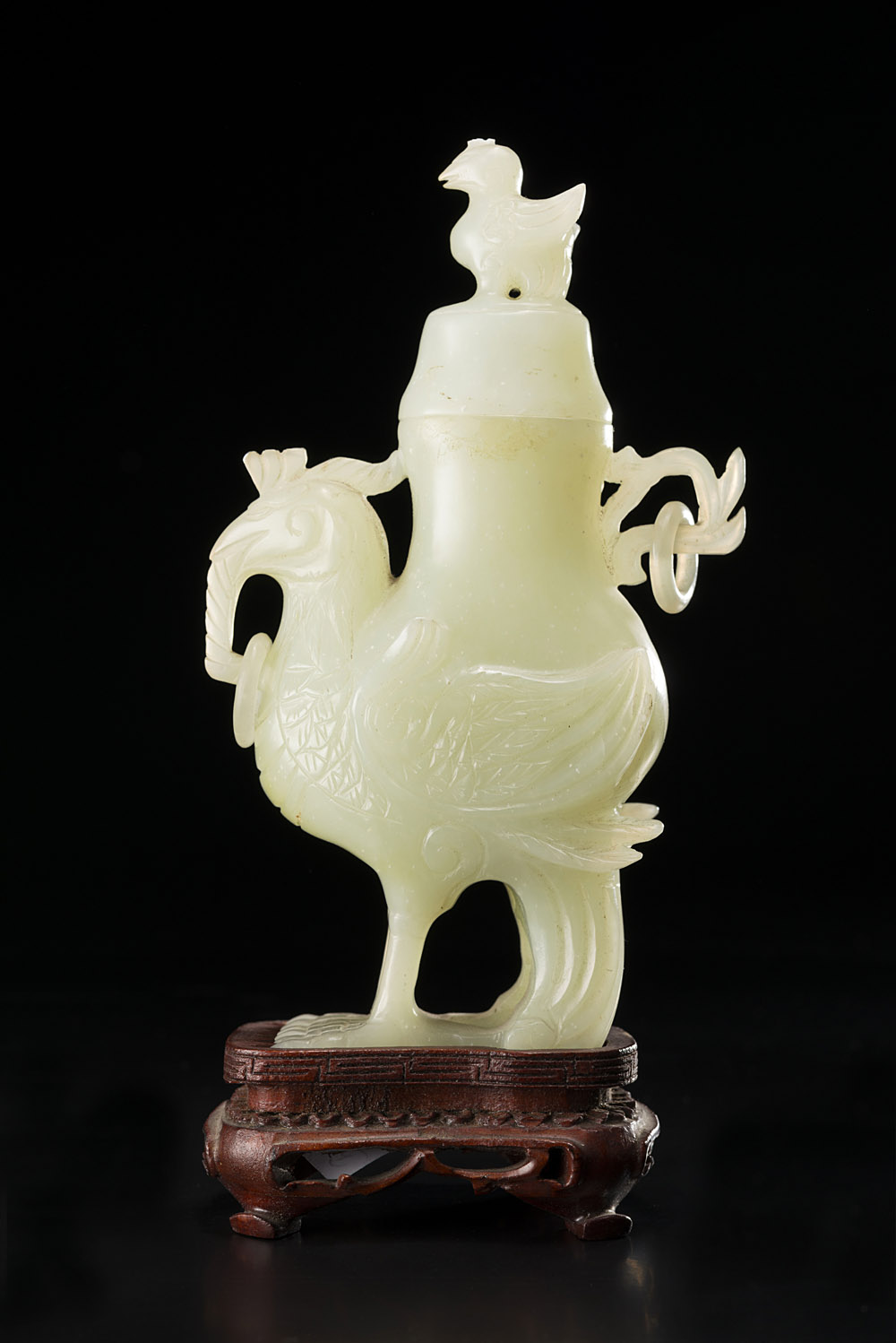 Vaso arcaistico con coperchio in pietra dura a forma di fenice (piccole mancanze), base in legno Cina, sec. XX An archaistic hardstone vessel, in the form of a phoenix (losses), wood base China, 20th century (h cm 15)