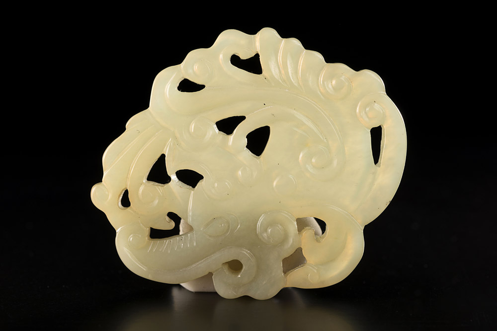 Placca in giada intagliata e traforata raffigurante un drago stilizzato, la...
