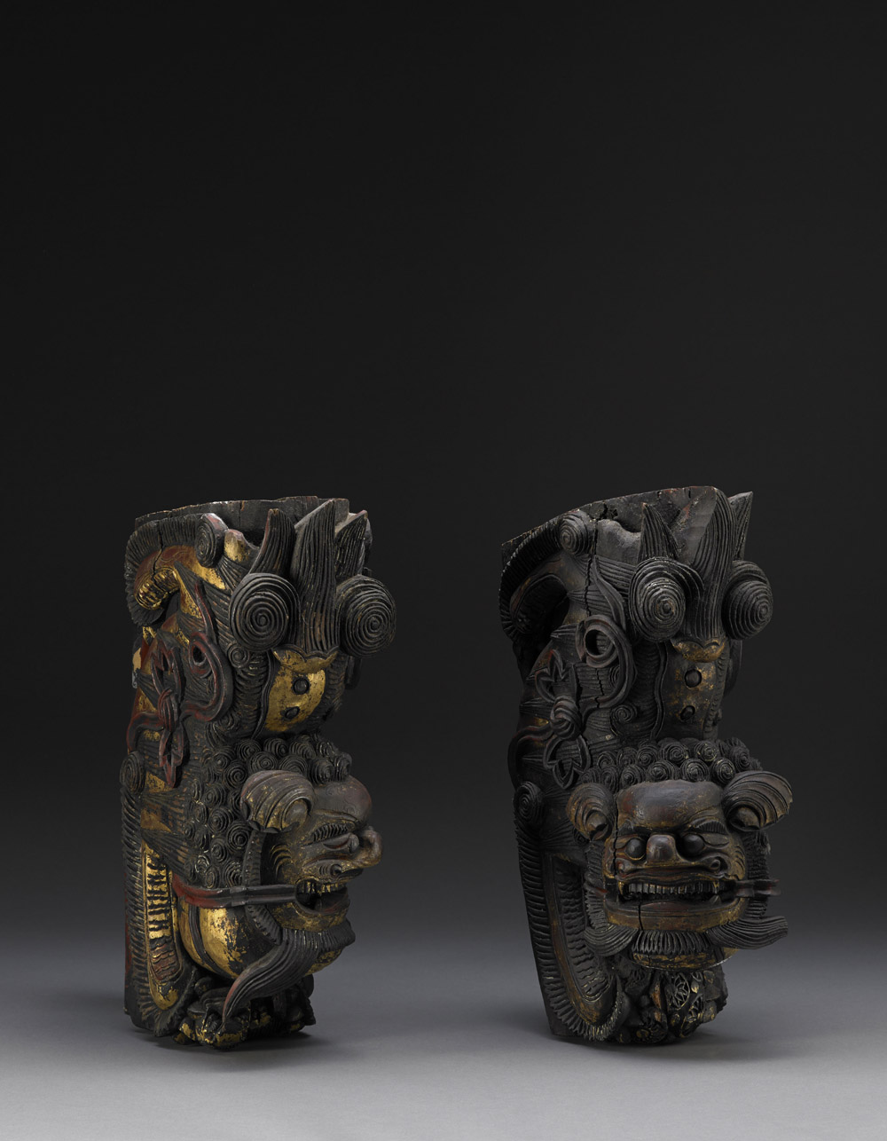 Coppia di fregi in legno intagliato e dorato raffiguranti due leoni buddhisti Cina, XIX/XX secolo A pair of gilt carved wood Buddhist lions China, 19th/20th century (l cm 46)