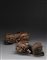 Coppia di fregi in legno intagliato e dorato raffiguranti due leoni buddhisti Cina, XIX/XX secolo A pair of gilt carved wood Buddhist lions China, 19th/20th century (l cm 43)