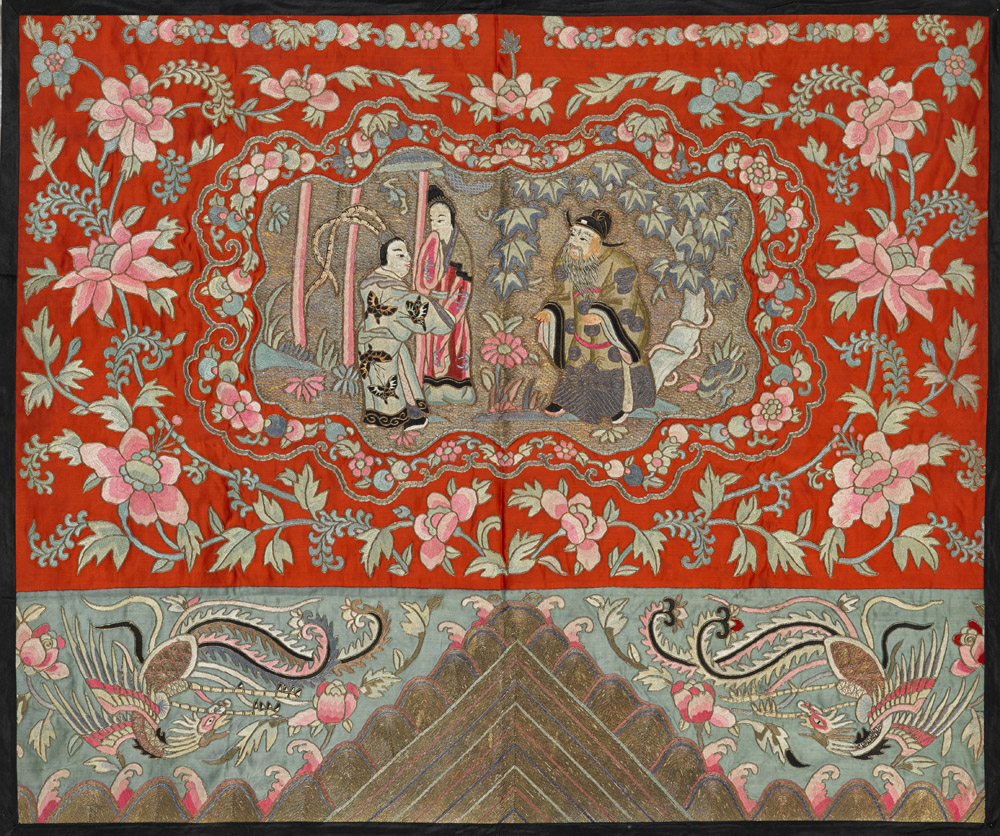 Ricamo rettangolare in seta, decorato al centro con tre Immortali su fondo dorato, circondato da fiori su fondo rosso, con una banda turchese decorata con coppia di fenici Cina, sec. XX A redground embroidered panel, decorated with three Immortals to the centre surrounded by flowers on a red ground, above a turquoise band with a pair of phoenix China, 20th century (cm 96x80)