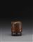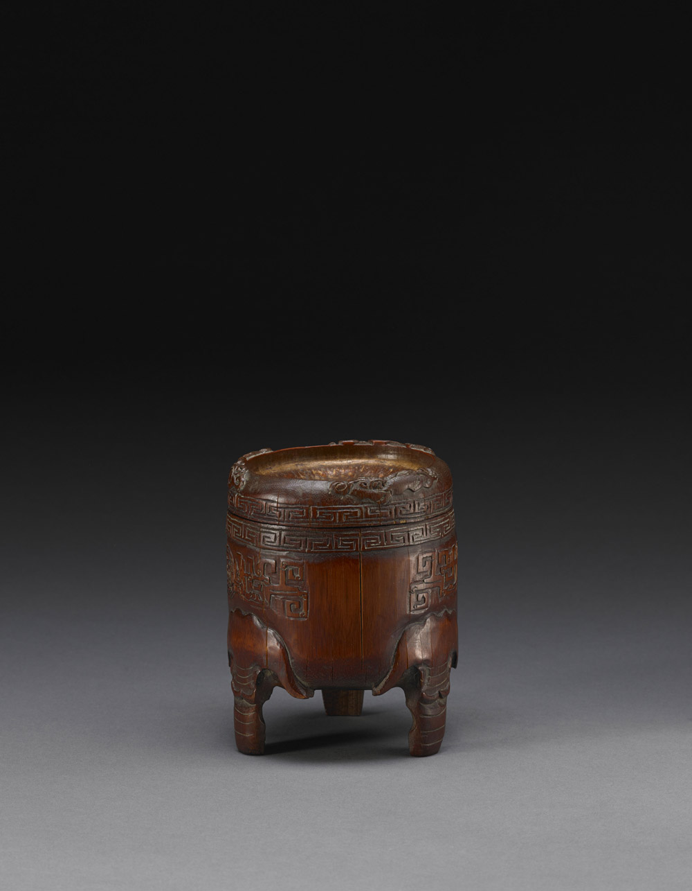 Scatola cilindrica tripode con coperchio in bambù intagliata con decorazioni geometriche arcaiche, dettagli di creature mitologiche sul bordo Cina, sec. XX A carved bamboo cylindrical box and cover, raised on three supports, with archaic geomtric decoration and mythical beasts on the cover China, 20th century (h cm 15)