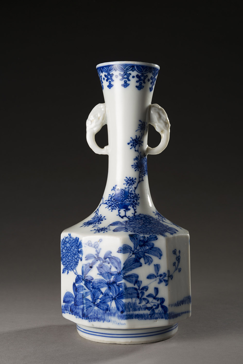 Piccolo vaso in porcellana bianca e blu, la base decagonale, il collo con due teste elefantine, decorato con rami fioriti Giappone, XIX/XX secolo A small blue and white porcelain vase, with ten-sided base, the neck with twin elephant head-handles, painted with flowering branches Japan, 19th/20th century (h cm 22)