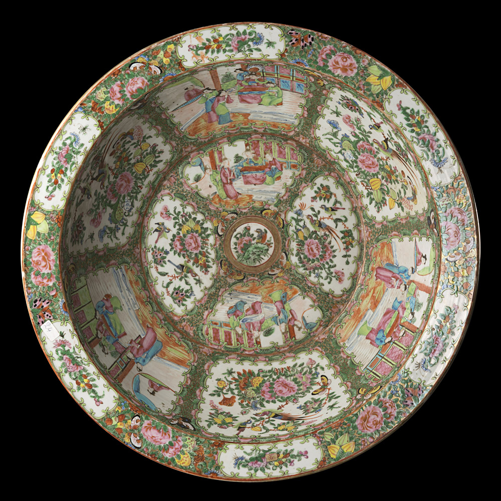 Grande bacile in porcellana Famiglia Rosa cantonese decorato in smalti e doratura con scene di palazzo e motivi floreali (difetti) Cina, sec. XIX A large Cantonese Famille Rose basin enamelled and gilt with interior scenes surrounded by rich floral decoration (defects) (diam. cm 46)