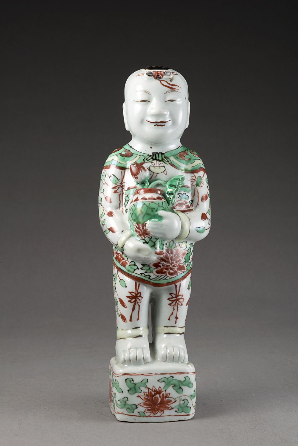 Statua in porcellana raffigurante un fanciullo con in mano un vaso, decorata a smalti della Famiglia Verde, wucai Cina, regno Kangxi (1662-1722) A Famille Verte figure of a boy. China, Kangxi period (1662-1722) (cm 27,5x9x7) Prov.: with tag of Galerie Bertrand De Lavergne, Paris