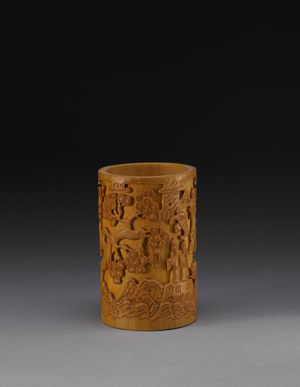 Portapennelli in bambù intagliato, decorato con studiosi in un paesaggio con...