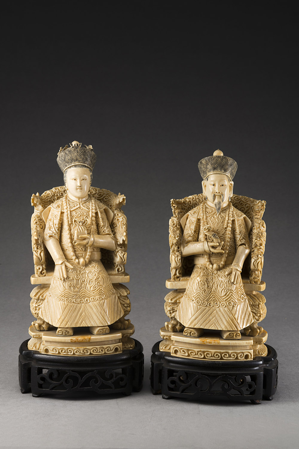 Coppia di statue in avorio raffiguranti l'imperatore e l'imperatrice seduti...