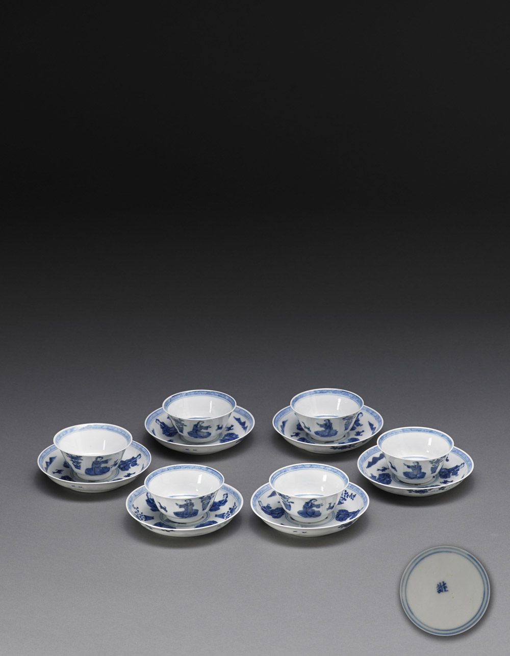 Set di sei piccole ciotole con piattini in porcellana bianca e blu decorati con dame con cagnolini e fiori, marchio "shei" alla base (alcune mancanze) Cina, XIX/XX secolo A set of six small bowls and saucers decorated in blue and white with elegant ladies amongst dogs and flowers, mark "shei" to the base (some losses) China, 19th/20th century (il piattino/the saucer diam. cm 12,5)