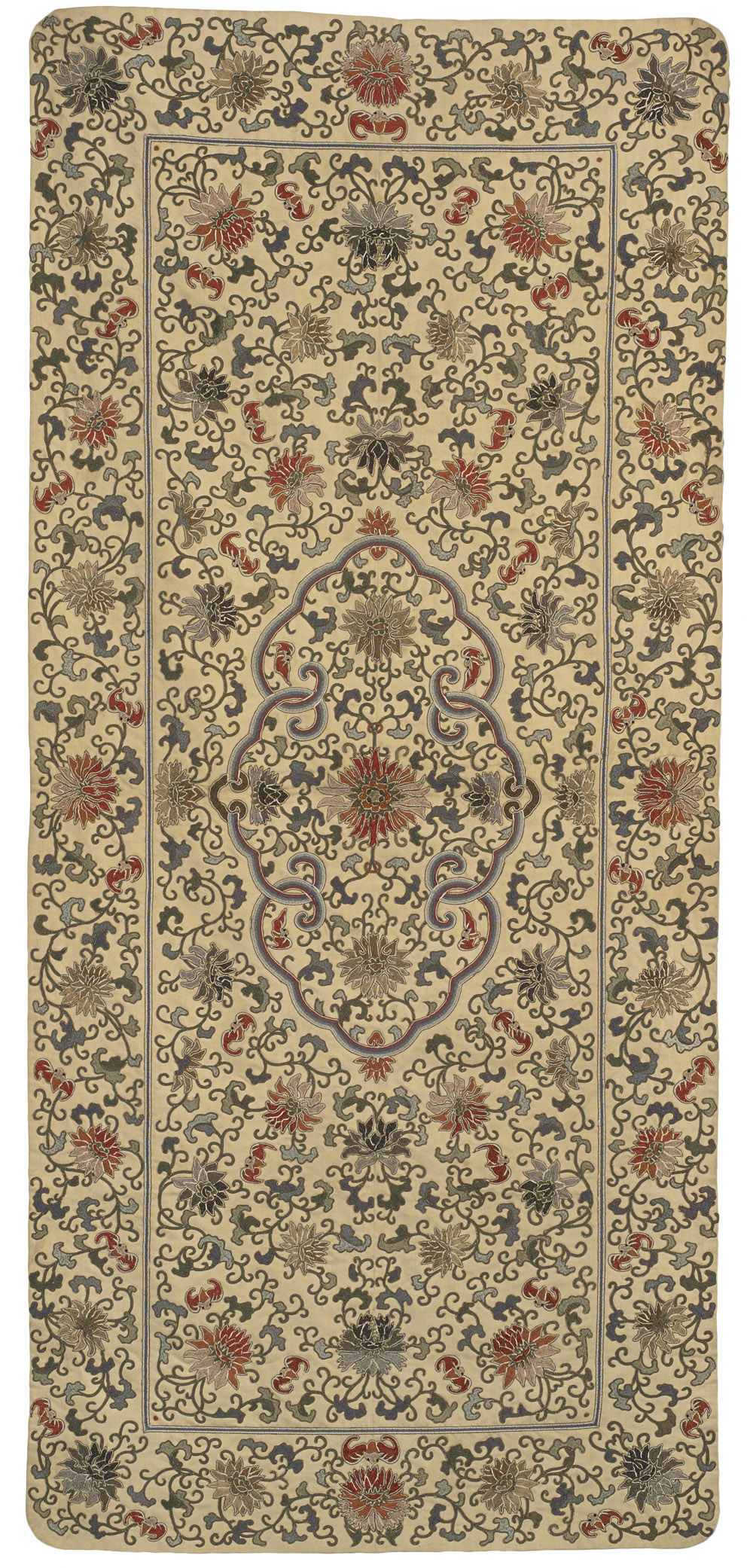 Coperta per 'kang' imperiale in seta gialla chiara ricamata, con fili dorati e di vari colori, raffinamente decorata con losanga centrale, fiori di loto circondati da ricco fogliame e pipistrelli Cina, dinastia Qing, sec. XIX An embroidered imperial pale yellow satin 'kang' cover, finely embroidered in gold and polychrome threads, the centre with a lobed cartouche at the centre, lotus flowers, scrolling foliage and auspicious bats China, Qing dynasty, 19th century (cm 120x53)
