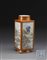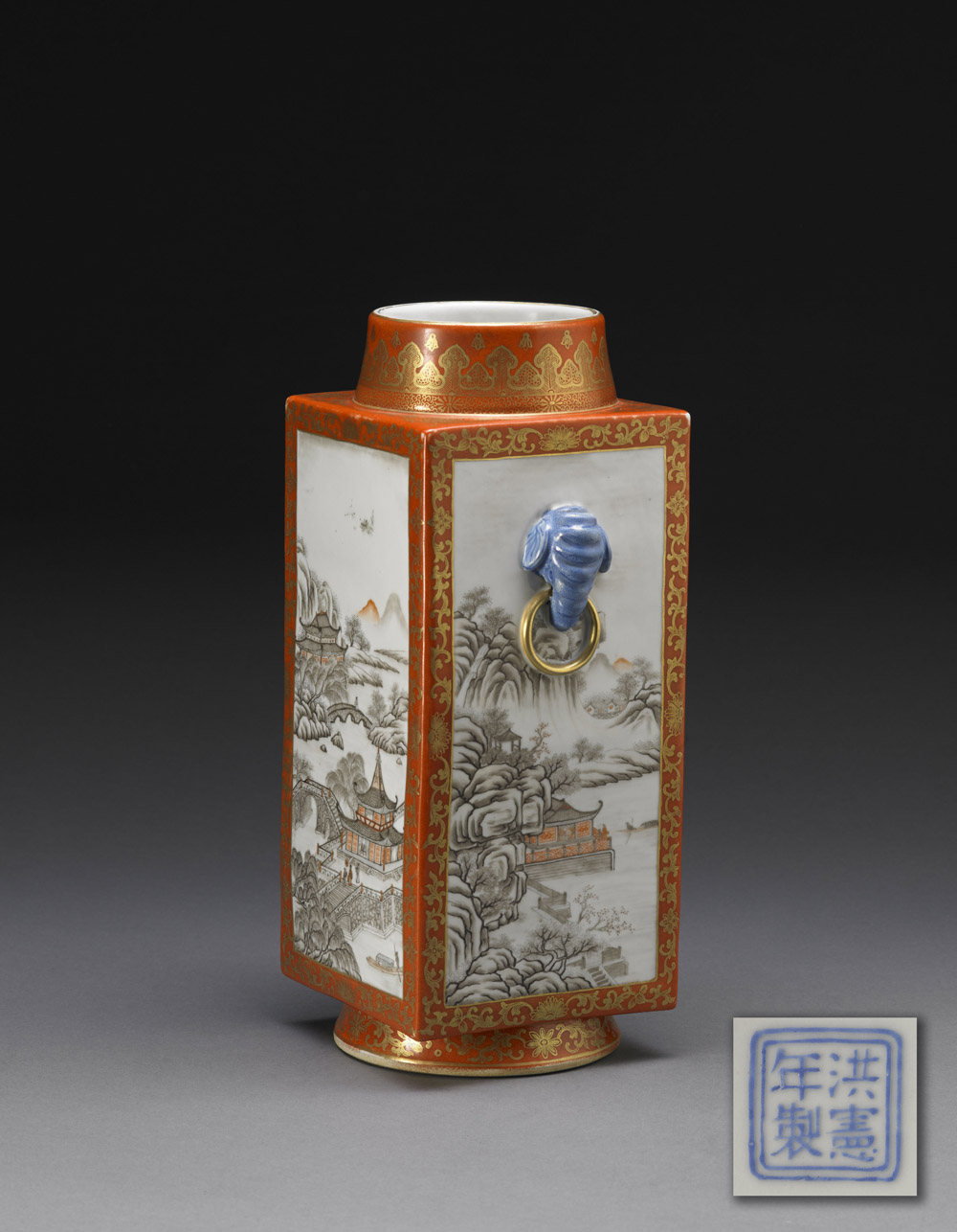 Vaso in porcellana a base quadrata, con maschere applicate con anelli, ogni lato decorato in en-grisaille con scene di paesaggio, circondati da decorazione dorata su fondo corallo, marchio Hongxian Nianzhi alla base Cina, Periodo della Repubblica (1912-1949) A square-sectioned porcelain vase with applied monster-head and ring handles, each side decorated en-grisaille with a landscape scene surrounded by gilt foliage on a coral ground, mark Hongxian Nianzhi to the base China, Republic period (h cm 34)