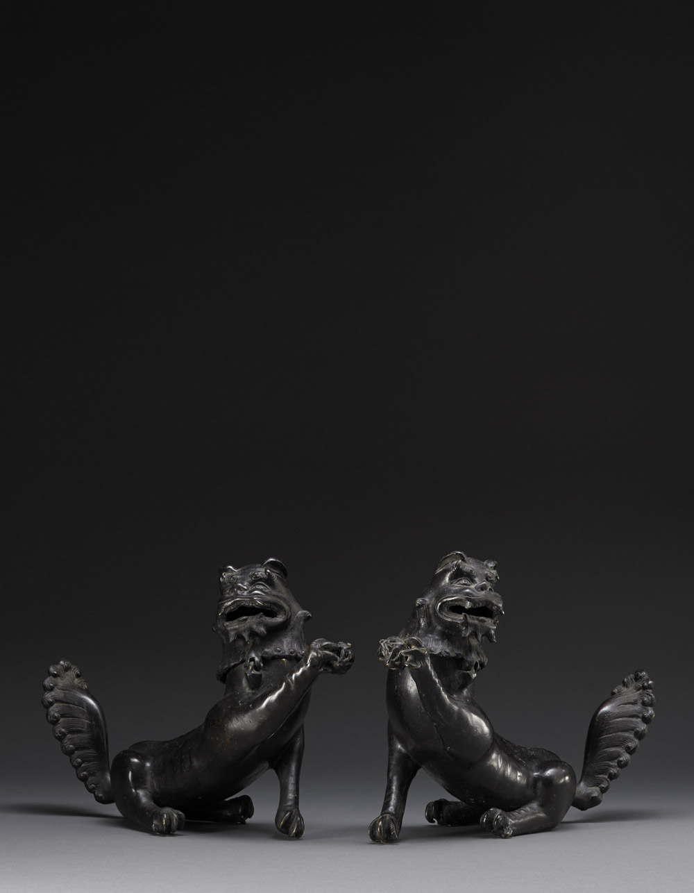 Coppia di brucia incenso in bronzo a forma di leoni Buddhisti, raffigurati seduti con una palla di broccato tra le zampe, la testa removibile fissata da un lato, dettagli della coda, della criniera e delle zanne finemente realizzati, buona patinatura (piccole mancanze) Cina, dinastia Ming (1368-1644) A pair of bronze incense-burners modelled as deated Buddhist lions, a brocade ball clutched by the paws, with semi-detachable heads, fine details of the tails, manes and fangs, nice patina (minor losses) China, Ming dynasty (1368-1644) (h cm 26,5)