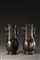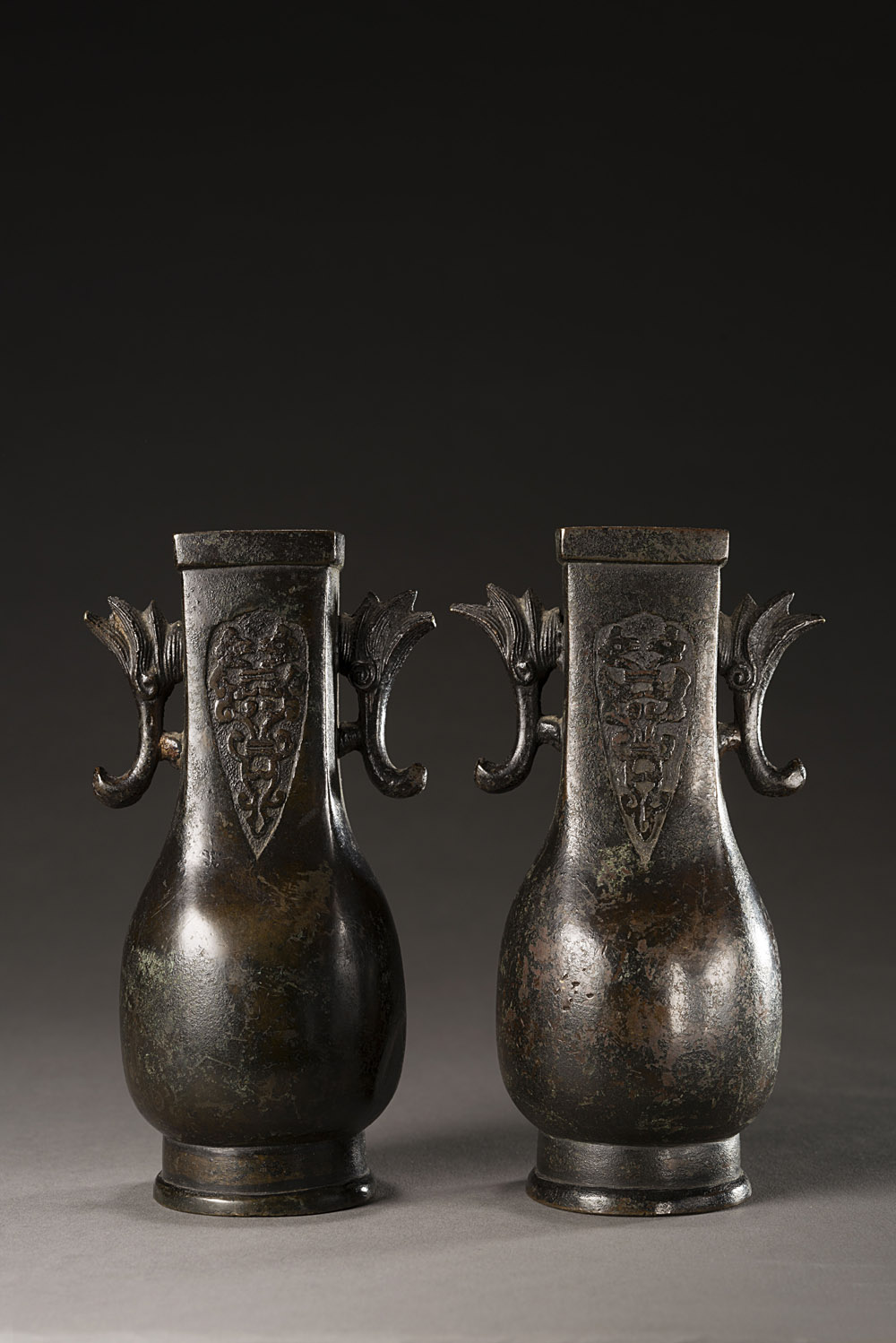 Coppia di vasetti in bronzo dal corpo di forma rotonda e collo squadrato, ciascuno con due anse decorate ai lati, con decorazione geometrica e stilizzata in stile arcaico Cina, dinastia Ming (1368-1644) A pair of small bronze vases, each with rounded body and rectangular neck flanked by twin handles, decorated with archaic stylised and geometric motifs China, Ming dynasty (1368-1644) (h cm 13)