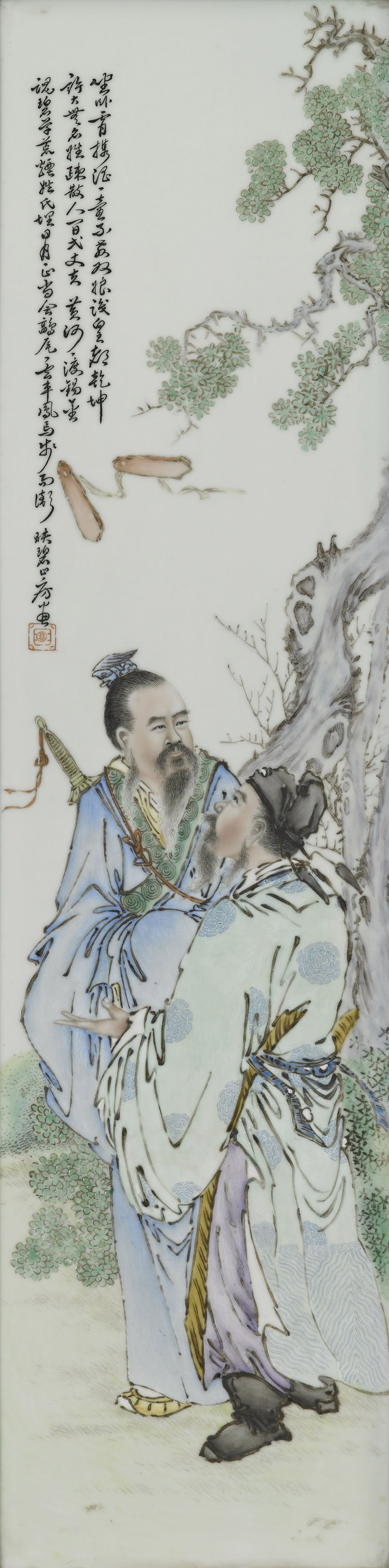 Placca in porcellana di forma rettangolare, decorata in smalti policromi con due letterati con lunghe vesti e copricapi sotto un albero di pino, con calligrafia e sigillo, con cornice in legno intarsiato Cina, Periodo della Repubblica (1912-1949) A rectangular porcelain plaque, decorated in colourful enamels with two scholars standing underneath a pine tree, wearing hats and long robes, calligraphy and seals, with wood frame China, Republic period (1912-1949) (cm 20,5x81)