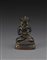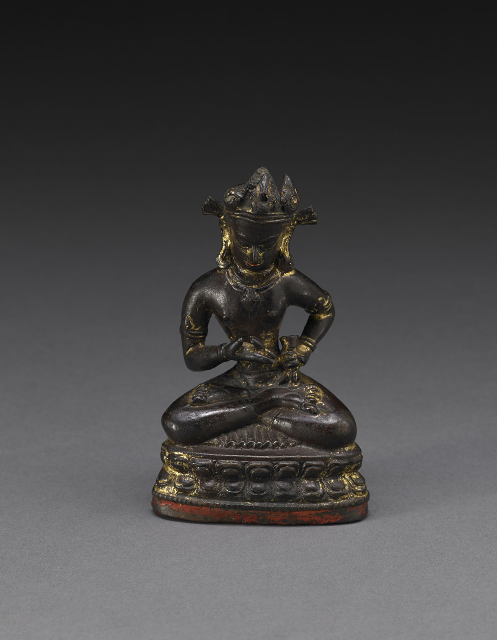 Piccolo bodhisattva in bronzo con tracce di doratura, raffigurato seduto nella posizione dhysanasana su base a fiori di loto, con un piccolo vaso nella mano sinistra, indossa corona elaborata e collane ornamentali Cina/Tibet, XVIII/XIX secolo A small bronze figure of a bodhisattva with traces of gilt, depicted seated in dhysanasana on a lotus base, holding a small vessel in her left hand, wearing an elaborate crown and dangling necklaces China/Tibet, 18th/19th century (h cm 11)