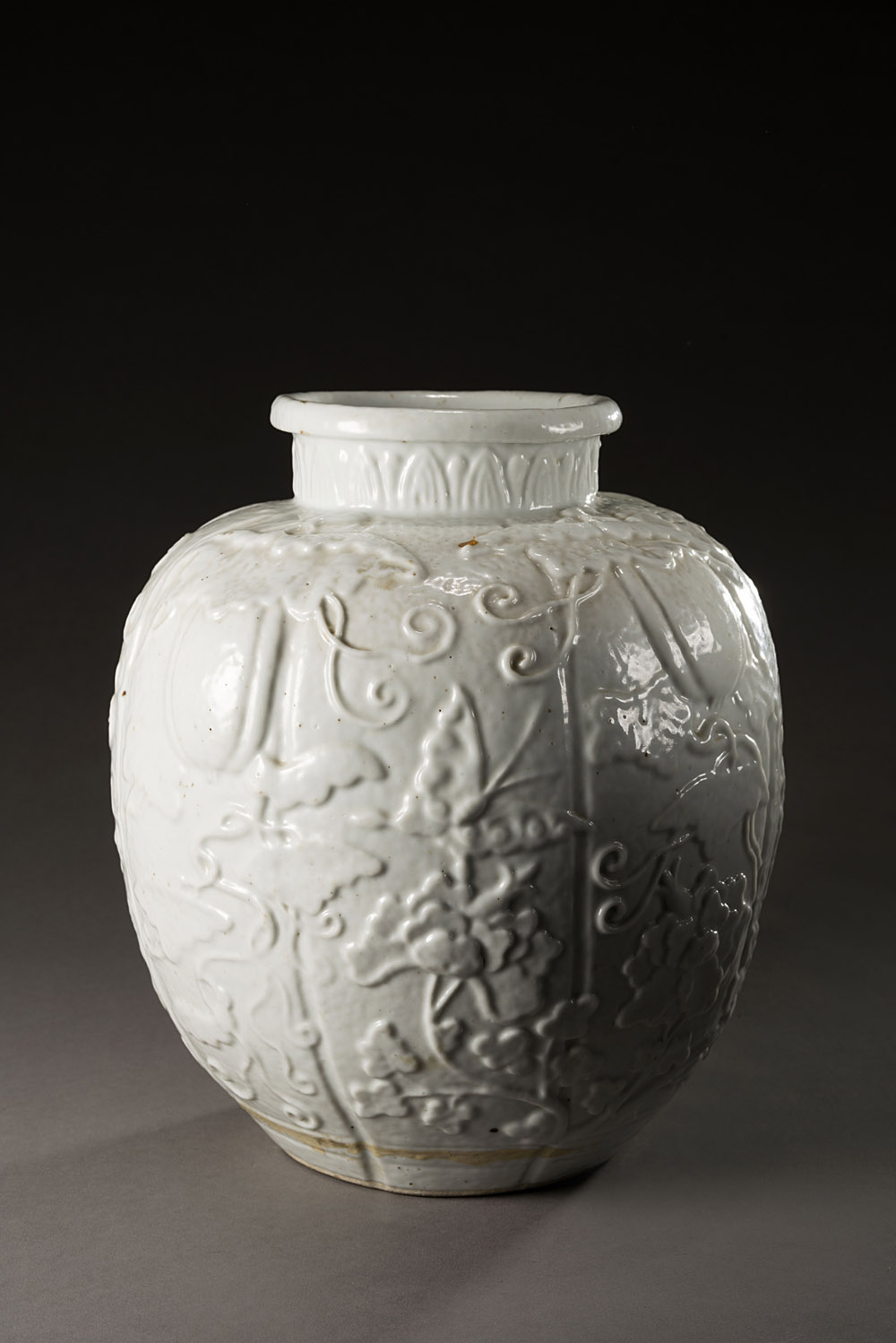 Giara bianca in porcellana a pasta tenera, lobata, decorata a rilievo con rigogliosi meloni e rami con foglie Cina, sec. XIX A soft-paste porcelain white jar, of lobed form, decorated with fruiting melons with leaves and trellis China, 19th century (h cm 25)