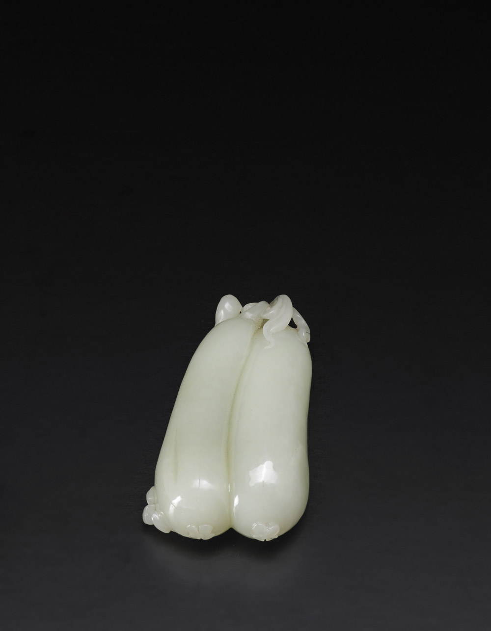 Piccolo gruppo in giada color celadon raffigurante due melanzane con foglie, piccoli fiori e un pipistrello, la pietra con naturali inclusioni e venature Cina, sec. XX * Lotto assogettato a regime di IVA ordinaria A small celadon double aubergine group, with trellis, leaves and small flowers, a small bat resting on them, the stone with natural inclusions and flaw lines China, 20th century (h cm 8)