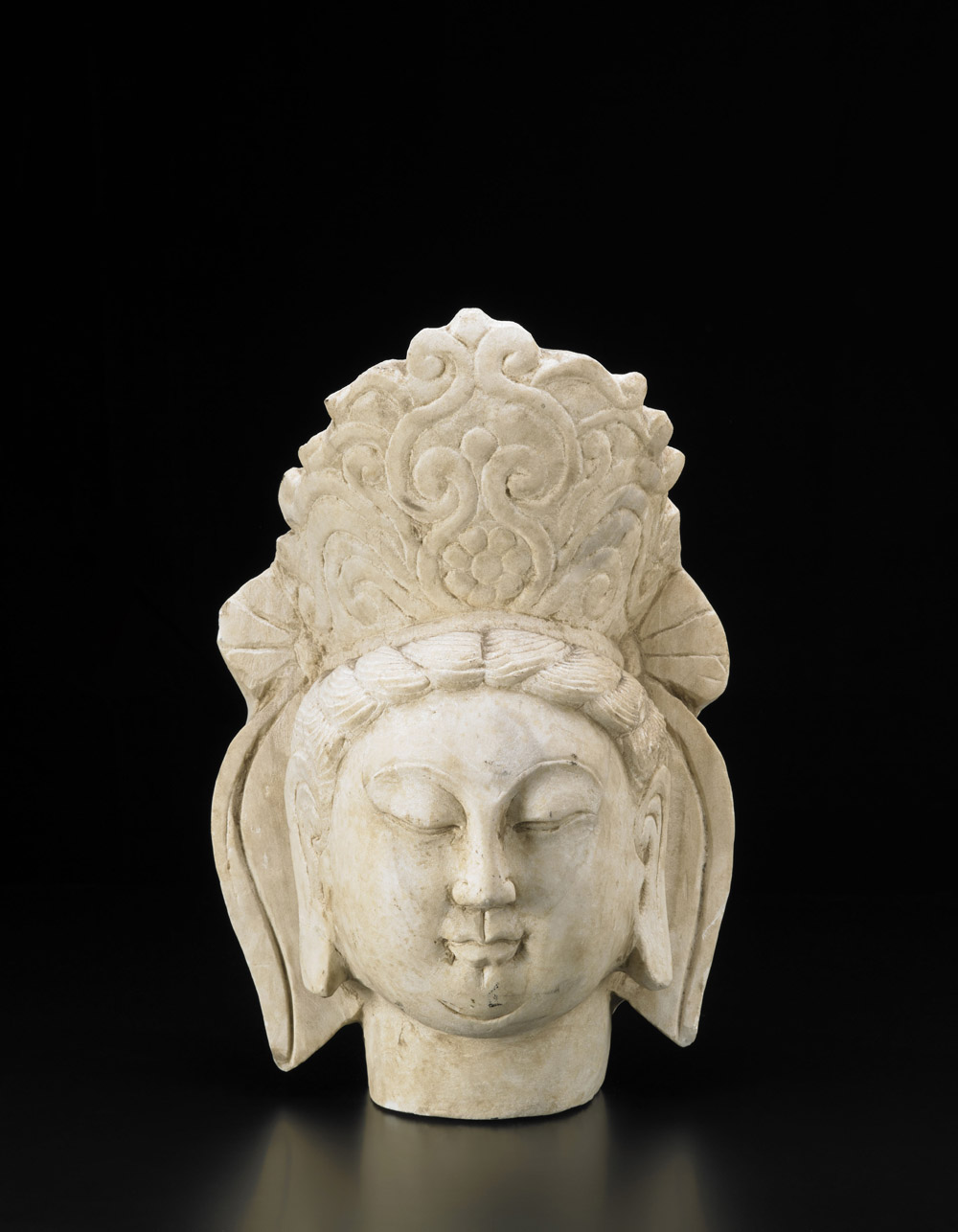 Testa di Guanyin in marmo, raffigurata con espressione serena e corona * Lotto assogettato a regime di IVA ordinaria A Guanyin marble head with elaborated crown and a serene facial expression