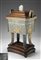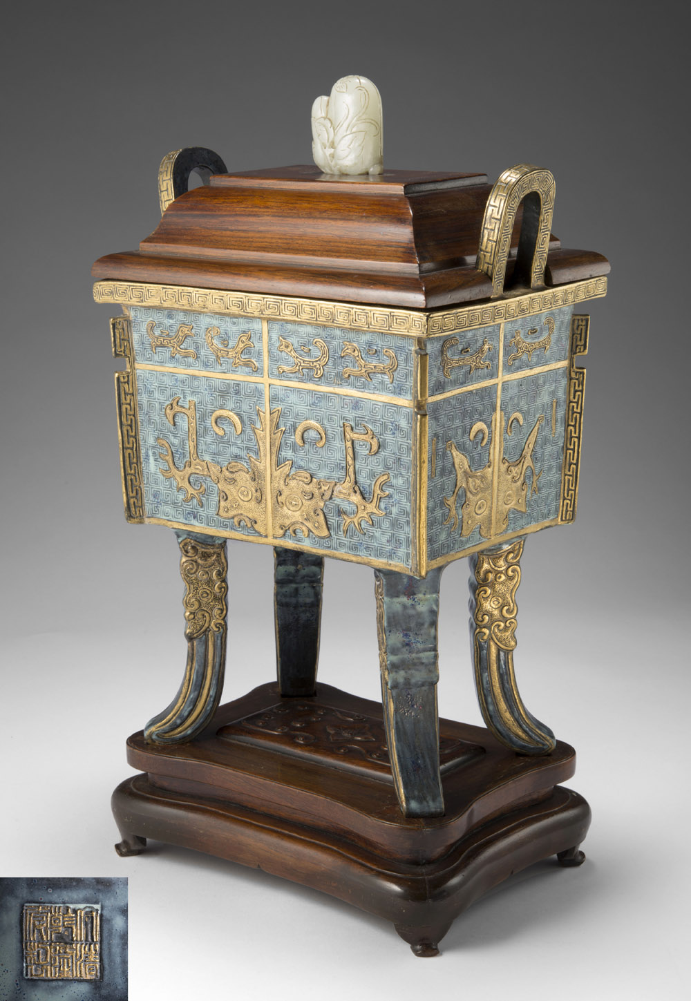 Importante incensiere a vetrina lujun (Robin's egg) a forma di bronzo rituale fangding, con base e coperchio di legno duro con pomolo di giada bianca a forma di frutto. La vetrina è tipicamente a fondo blu con iridescenze turchesi e leggere spruzzature porpora. La forma riprende nelle proporzioni e nella decorazione quella degli incensieri in cloisonné di periodo Qianlong (1735-1796) (restauri) Cina, periodo della Repubblica, marchio apocrifo Qianlong La vetrina lujun ("fornace Jun") era realizzata in seconda cottura a bassa temperatura, spruzzando su un fondo blu il colore turchese a formare colature che ricordavano in alcuni casi le iridescenze che si ritrovavano sui bronzi arcaici. Questa manifattura, che è continuata anche nel XX secolo, è assai rara e si associa a produzioni di alta qualità A robin's egg and gilt squared censer, fangding, apocryphal mark of Qianlong (restorations) China, Republic period (1912-1949) (cm 32x23,5x16,5) For a lujun hu vase with same mark and glaze in the Shenyang Palace Imperial Collections, see I tesori del palazzo imperiale di Shenyang, Milano, Fabbri Editori, 1989, p. 280, n. 55