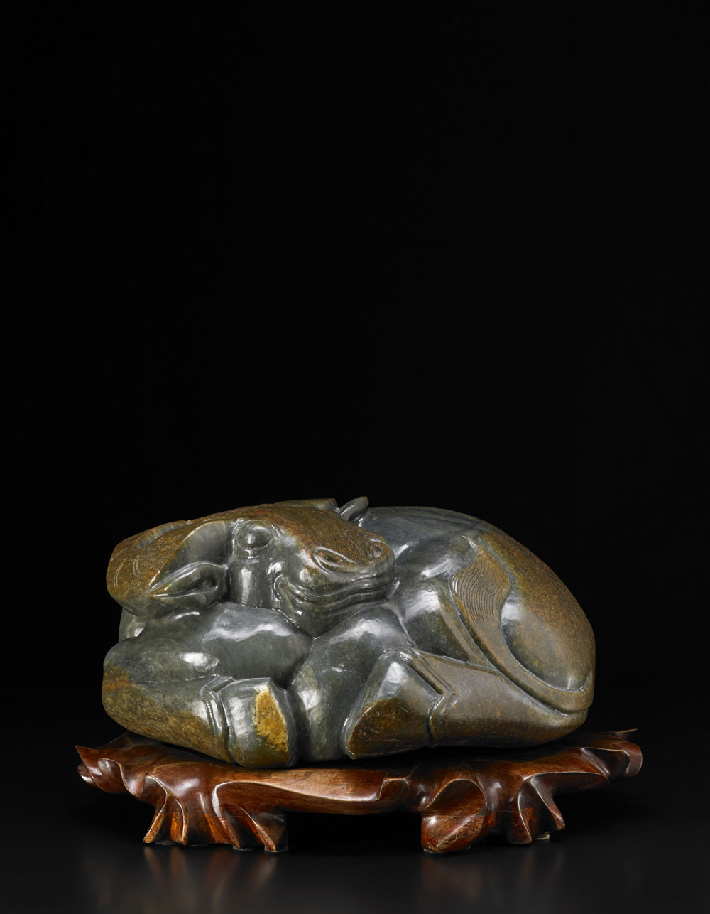Grande bufalo in giada verde spinacio e grigio, intagliato e decorato secondo lo stile Ming, l'animale accovacciato con la testa rivolta verso un lato, con dettagli delle corna, degli zoccoli e degli occhi finemente incisi, la pietra di un vivido color verde scuro con naturali inclusioni e venature color ruggine e altre tonalità, con base in legno scolpito Cina, sec. XX A large Ming-style spinach green and grey jade recumbent buffalo, the animal depicted with the head slightly turned to one side, details of the horns, the hoofs and the eyes finely incised, the stone of a vivid green tone with natural russet inclusions and flaw lines, with a carved wood base China, 20th century (cm 42x26x19)