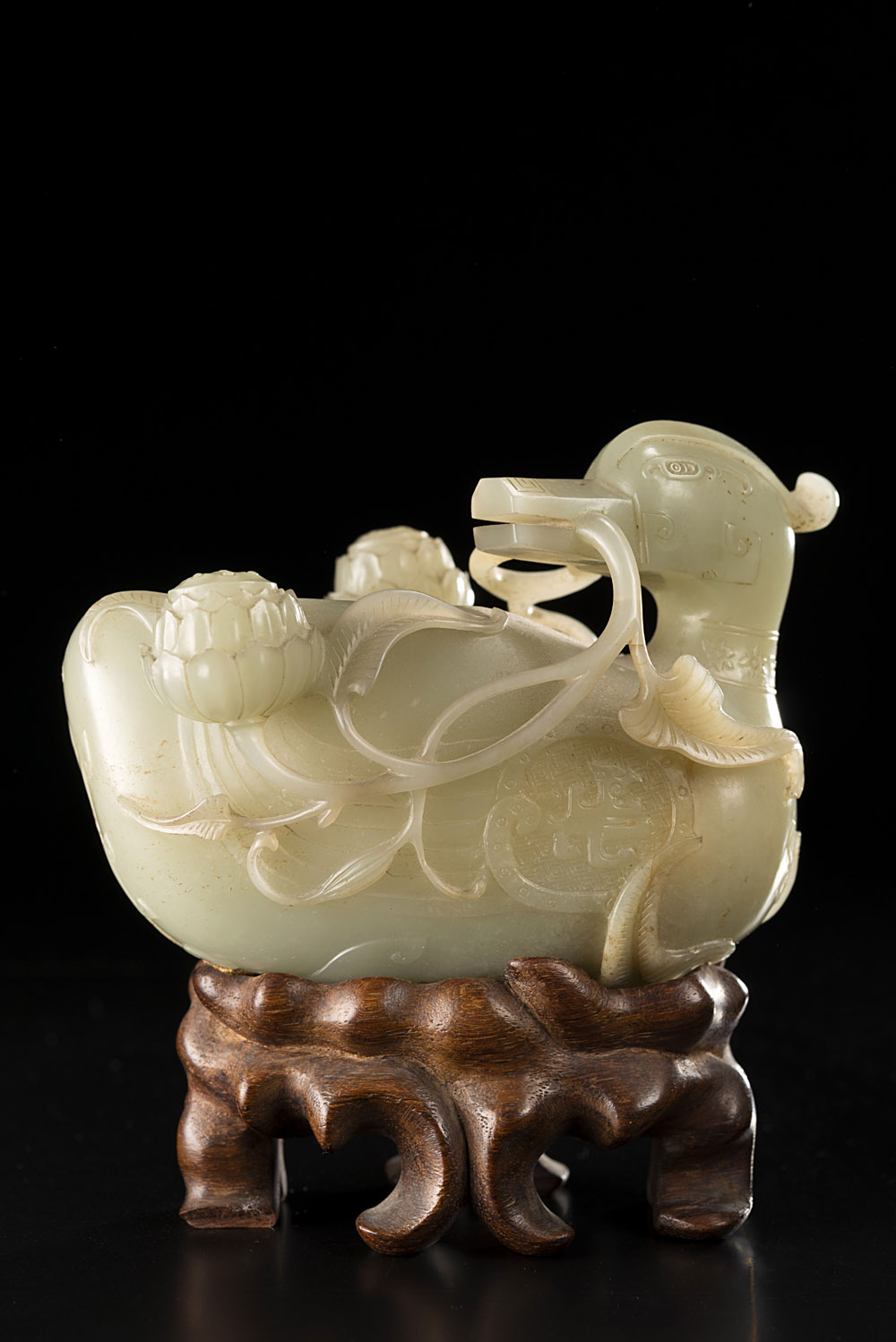 Vaso raffigurante anatra in giada color celadon, la testa girata sulla schiena, nel becco stringe due fiori di loto con lunghi rami e foglie, con decorazioni geometriche arcaiche raffinamente incise, la pietra con naturali inclusioni (coperchio mancante), base in legno Cina, XVIII/XIX secolo A celadon jade mandarin duck vessel, the head turning towards the back, grasping a leafy lotus stem, with finely incised archaistic geometric motifs, the stone with natural inclusions, wood base (cover missing) China, 18th/19th century (l cm 13)
