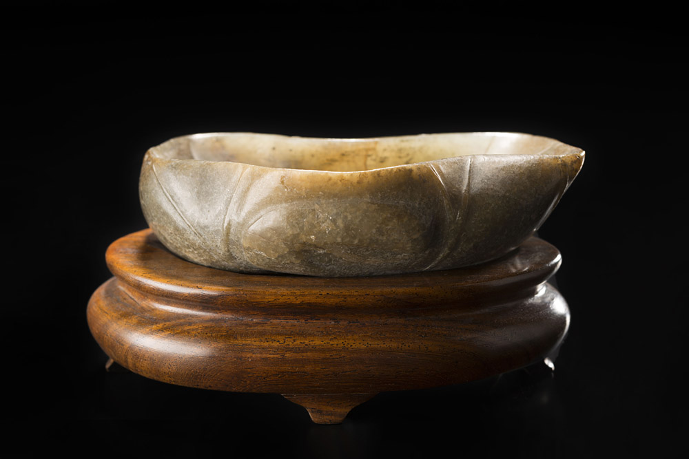 Lavapennelli in giada color celadon e ruggine a forma di foglia di loto, dettagli delle venature, la pietra con naturali inclusioni e venature, su base in legno Cina, sec. XIX A celadon and russet jade brushwasher, shaped as a lotus leaf with incised details of the veins, the stone with natural inclusions, wood base China, 19th century (l cm 10,5)