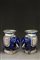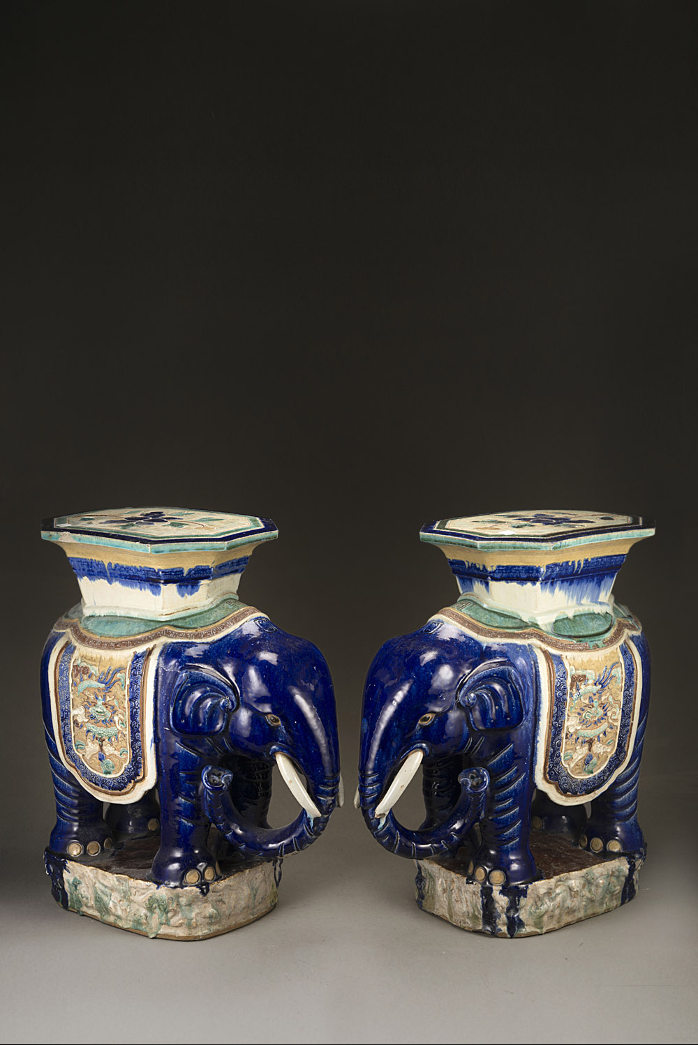 Coppia di elefanti in porcellana smaltata in blu turchese con sella decorata...