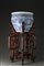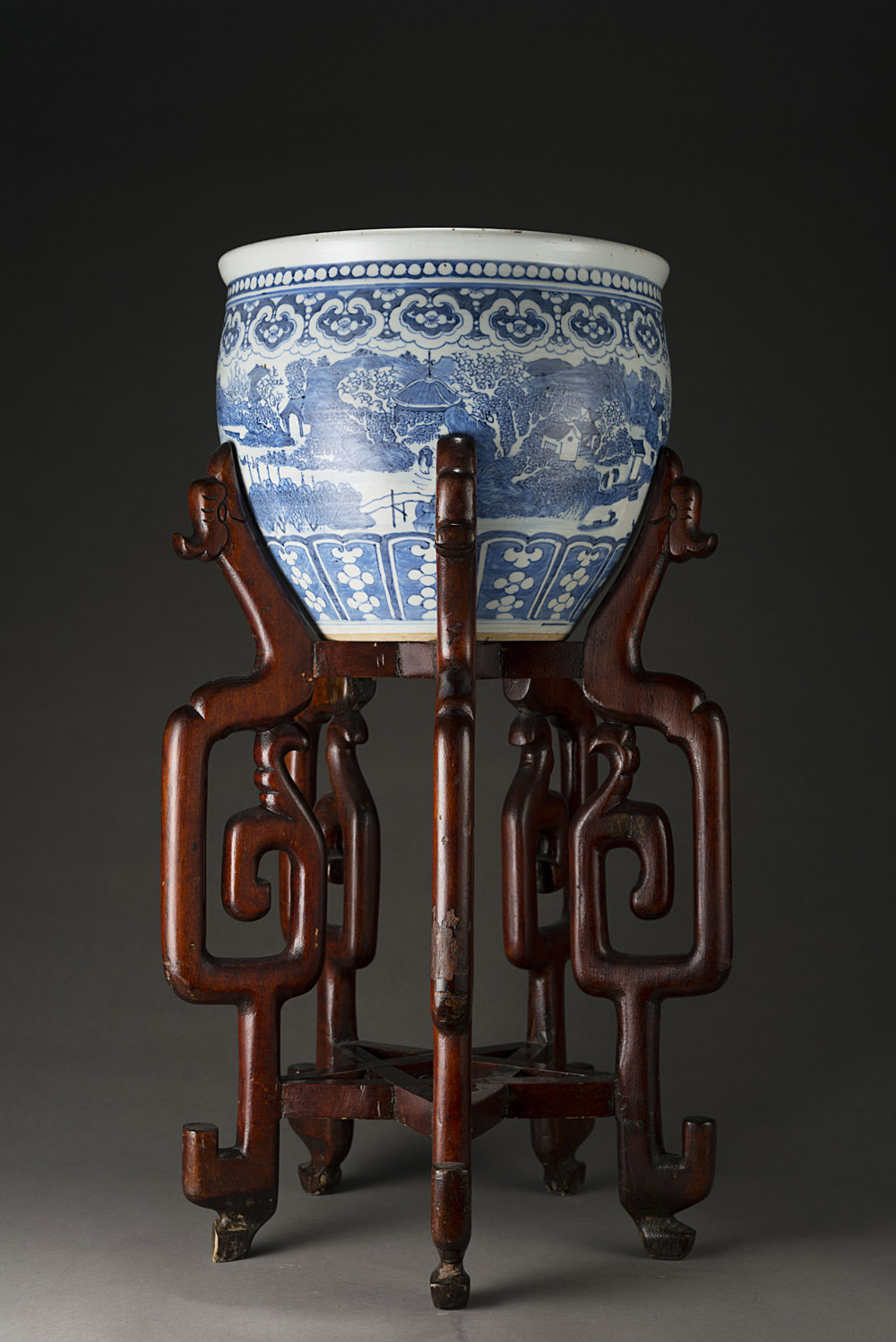 Jardiniere in porcellana bianca e blu, decorata con scena continua di figure in un paesaggio bordata con motivi geometrici (lievi difetti), base in legno Cina, sec. XX A blue and white jardiniere painted with a continuous landscape scene within two decorative borders (minor losses), wood stand China, 20th century (cm 25x30)