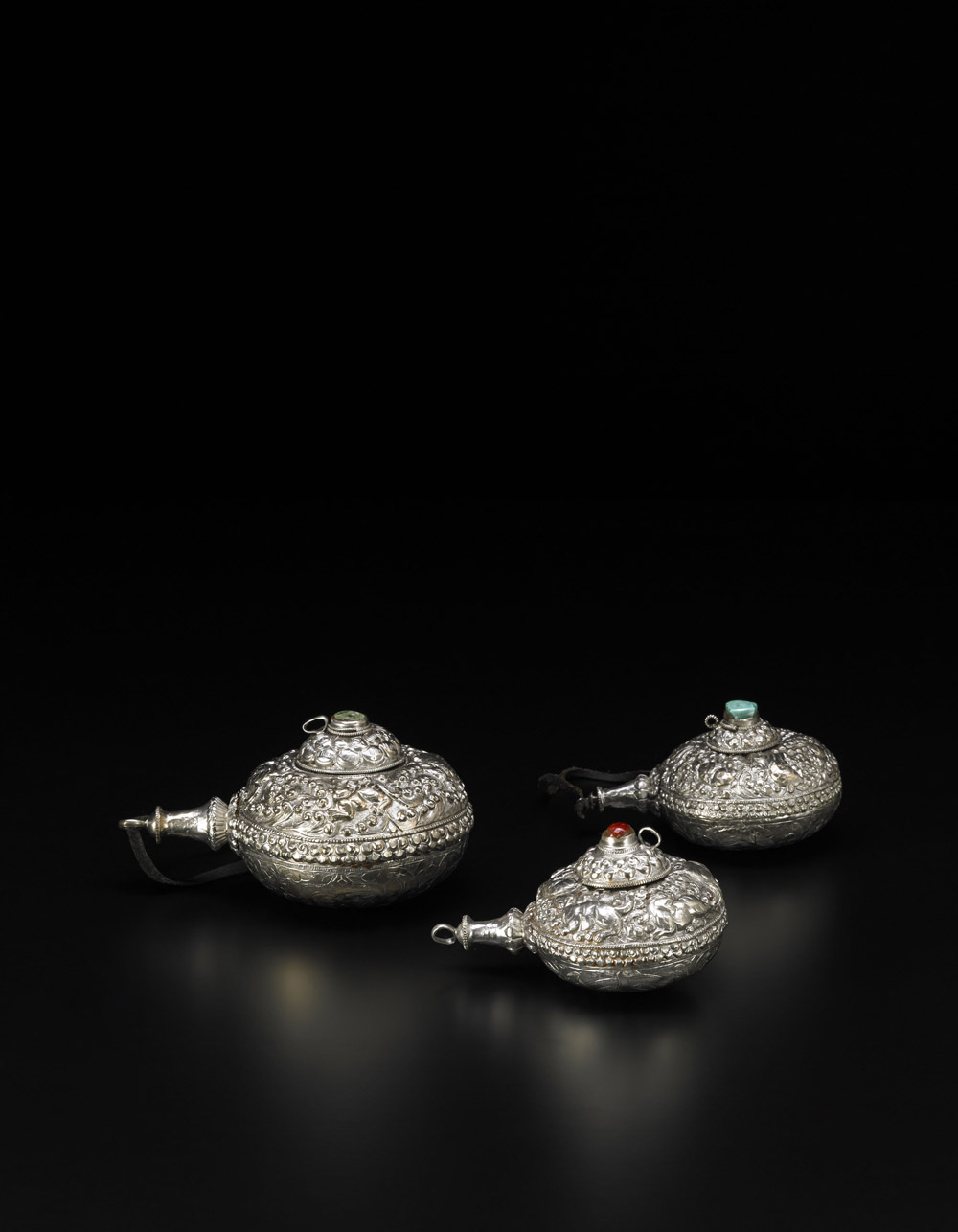Tre snuff bottles in argento di firma circolare, lavorate a sbalzo e decorate con pietre semipreziose Cina/Tibet, XIX/XX secolo Three silver snuff bottles, of circular form, each finely decorated and inset with hardstones China/Tibet, 19th/20th century (h max. cm 10)