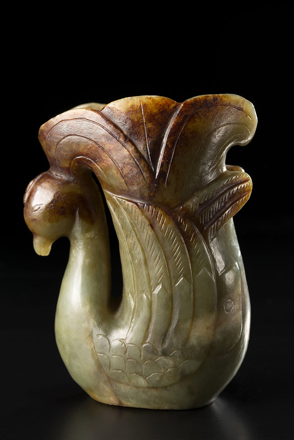 Antico Rhyton cinese in giada nefrite di colore verde con accentuate sfumature di ferro, a forma di cigno A Chinese antique swan shaped celadon jade Rhyton (cm 9,8x7x4,2)