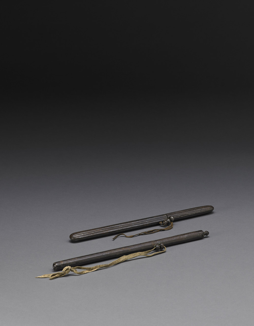 Due porta documenti in metallo, di forma cilindrica con anelli laterali e fettuccine in cuoio per chiusura, varie mancanze e difetti Cina/Tibet, XVIII/XIX secolo Two metal document holders, of cylindrical form, each with small rings and leather strings, areas with damages and losses China/Tibet, 18th/19th century (l max. cm 32)